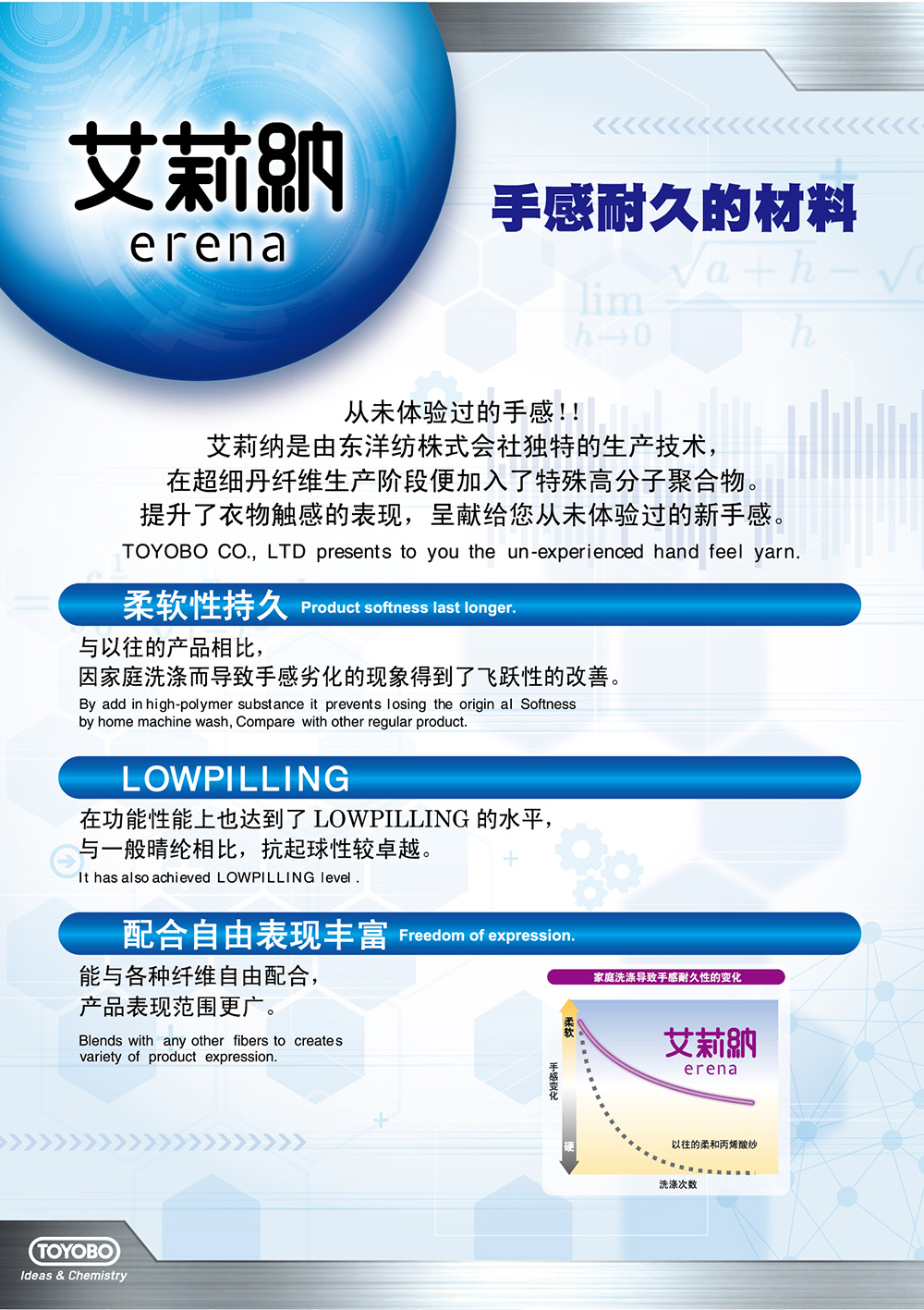東洋紡作為丙烯材料的領(lǐng)導(dǎo)者,功能性腈綸紗線一直處在業(yè)界領(lǐng)先地位,多種多樣的超細(xì)和功能性纖維可以組合出上百個(gè)品種。滿足您在功能和成本的選擇,兼顧手感與抗起球的平衡。與您一同創(chuàng)意更合適的產(chǎn)品組合,為您品牌發(fā)展助力!